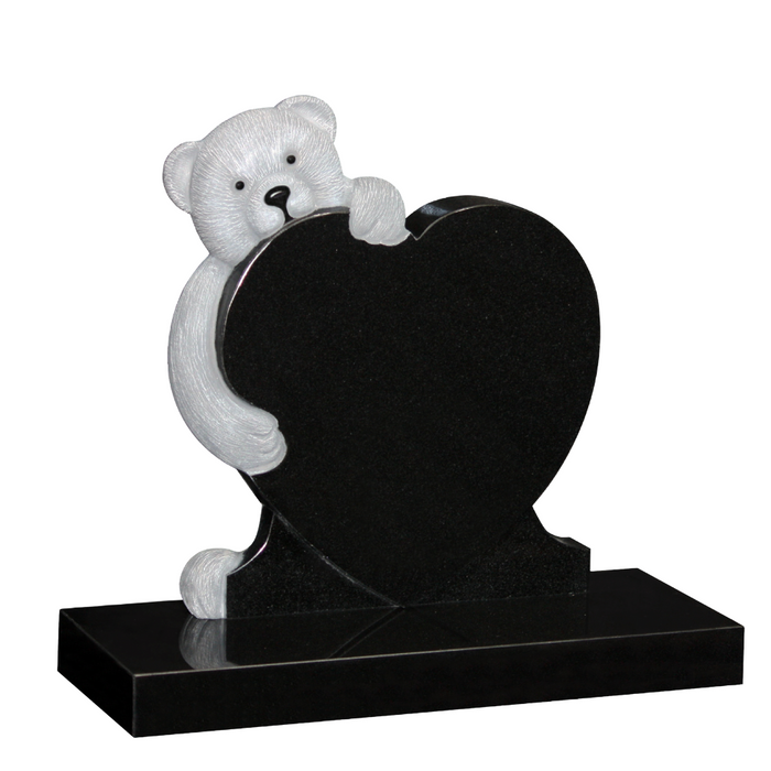 This child's headstone features a lifelike teddy bear, beautifully carved granite, peeking around a polished black granite oval. The bear's gentle expression and comforting presence offer a sense of peace and love, creating a lasting tribute to a precious child.