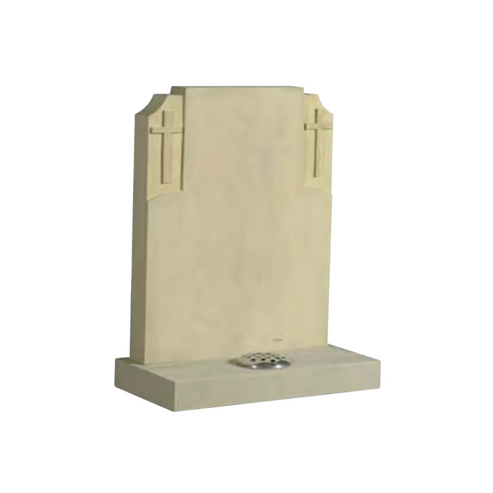 This elegant lawn memorial is crafted from traditional Yorkstone, offering a timeless and dignified tribute. The design features a classic rectangular shape with softly chamfered shoulders and a pair of delicately carved crosses for added spiritual significance. The warm buff tones of Yorkstone give the memorial a natural and enduring appeal. A wide base includes a single flower holder, adding both functionality and understated elegance.