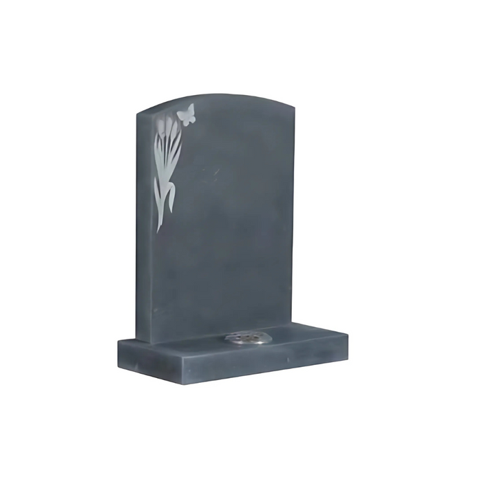 This graceful memorial is carved from traditional Celtic Limestone, featuring a softly arched top and a delicately etched floral and butterfly motif on the left shoulder. The natural dark tones of the stone provide a striking contrast to the engraved design, creating a peaceful and contemplative tribute. With a smooth honed finish and solid base including an integrated flower holder, this memorial offers understated elegance with a personal touch.