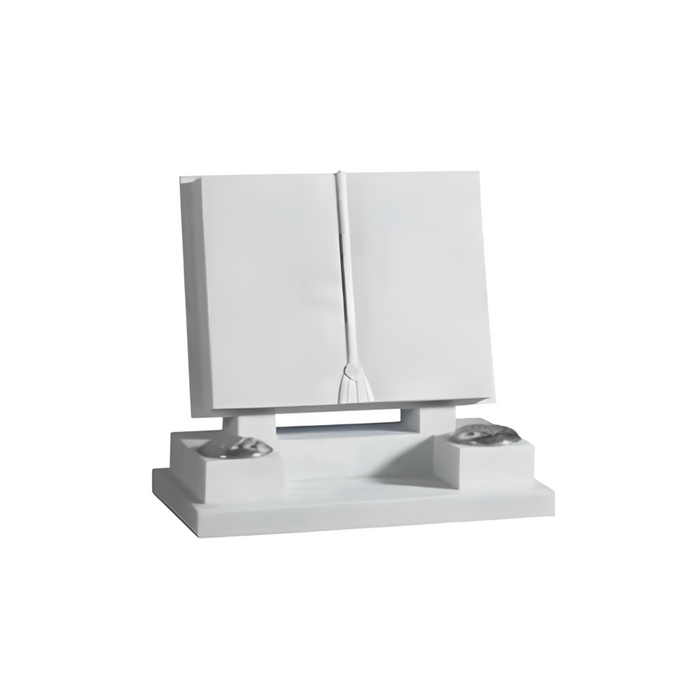 This distinctive lawn memorial is crafted from radiant White Marble and shaped into an open book design, symbolising a life story remembered and celebrated. The central tassel carving adds a delicate touch of realism, separating the pages and providing balance to the design. Supported by twin plinths and resting on a robust base with twin flower holders, this memorial is ideal for a shared tribute or dual inscriptions.