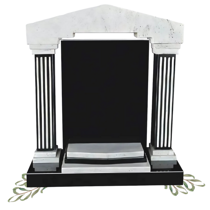 OG-51 - Black & Viscon White Granite Memorial with Temple Shape and Inlaid Grey Granite Strips - From £2895.35