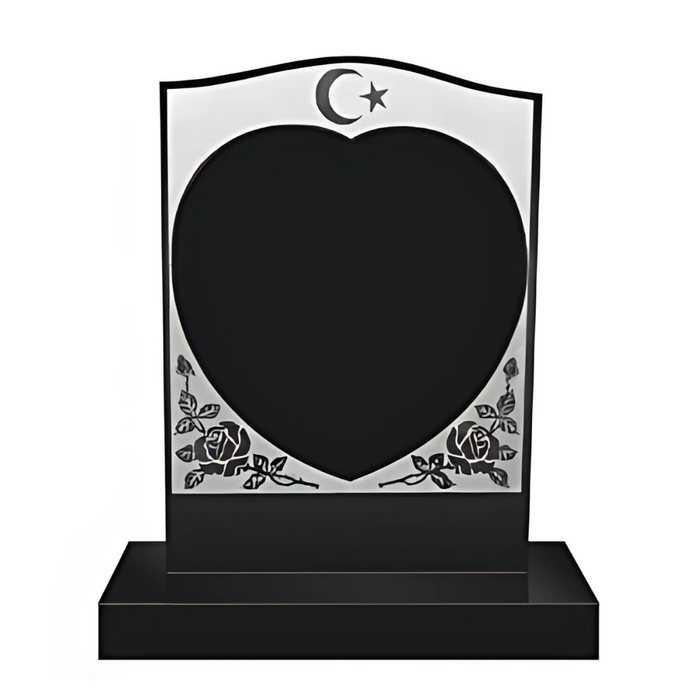 A striking black granite memorial featuring a crescent moon and star design, delicately adorned with carved roses and a heart-shaped panel for personalised inscriptions.