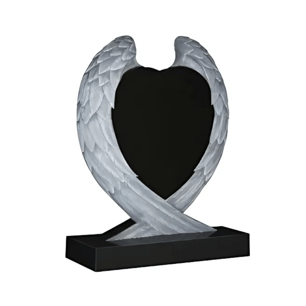A deeply emotive lawn memorial crafted from polished Black Granite, featuring a heart-shaped headstone lovingly embraced by hand-carved angel wings. This powerful and comforting design symbolises protection, eternal love, and spiritual guardianship, creating a lasting tribute to a cherished soul.