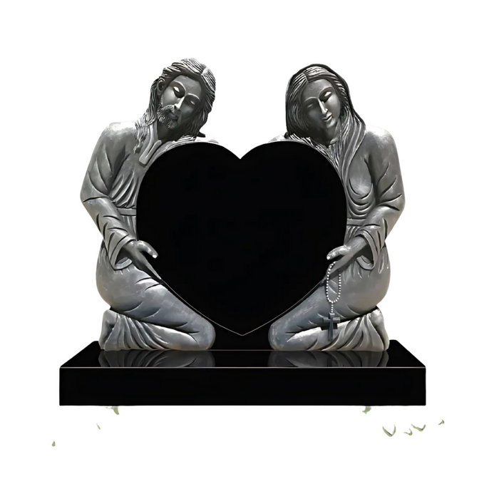 A reverent lawn memorial crafted from polished Black Granite, featuring a beautifully carved heart design depicting St Mary and Jesus. This deeply spiritual tribute embodies faith, compassion, and eternal love, offering comfort and devotion in honour of a dearly missed loved one.